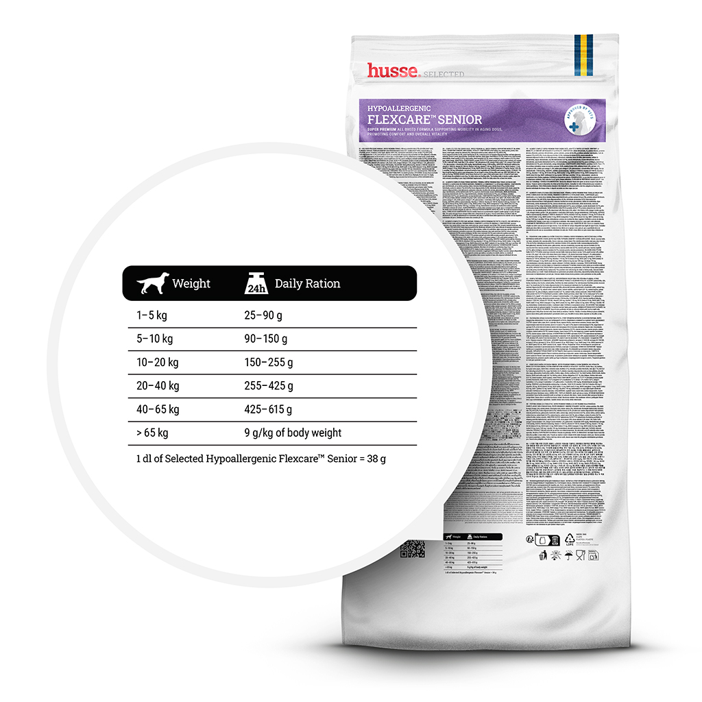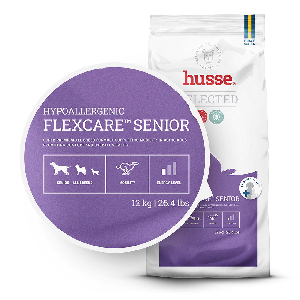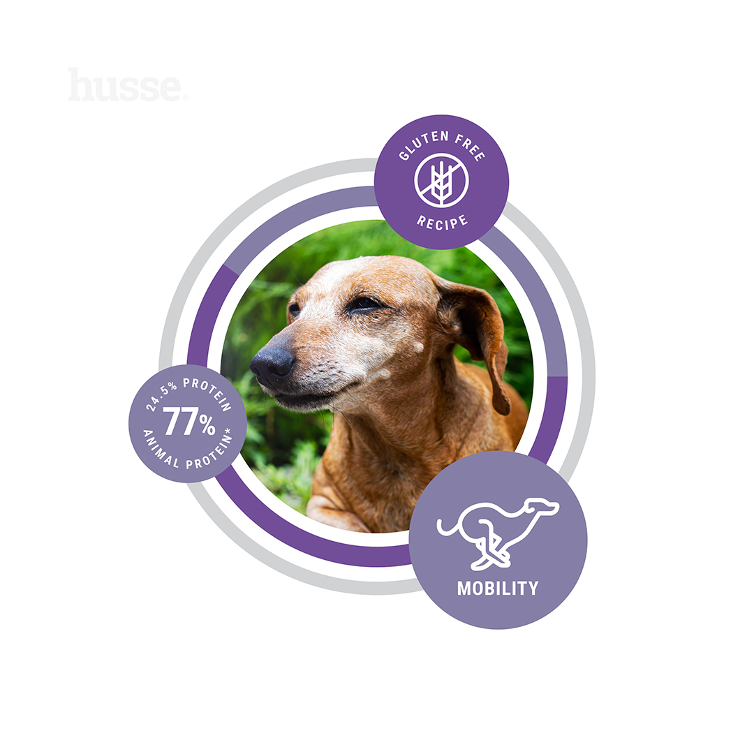 Hipoalergēns un viegli sagremojams, šis sausais suņu barība ir izgatavota no augstas kvalitātes sastāvdaļām, kas palīdz uzturēt un uzlabot locītavu kustīgumu. Tas ir bagātināts ar Husse Flexcare™ maisījumu, kas palīdz saglabāt aktīvu kustību un komfortu visu suņa seniora gadu laikā.
