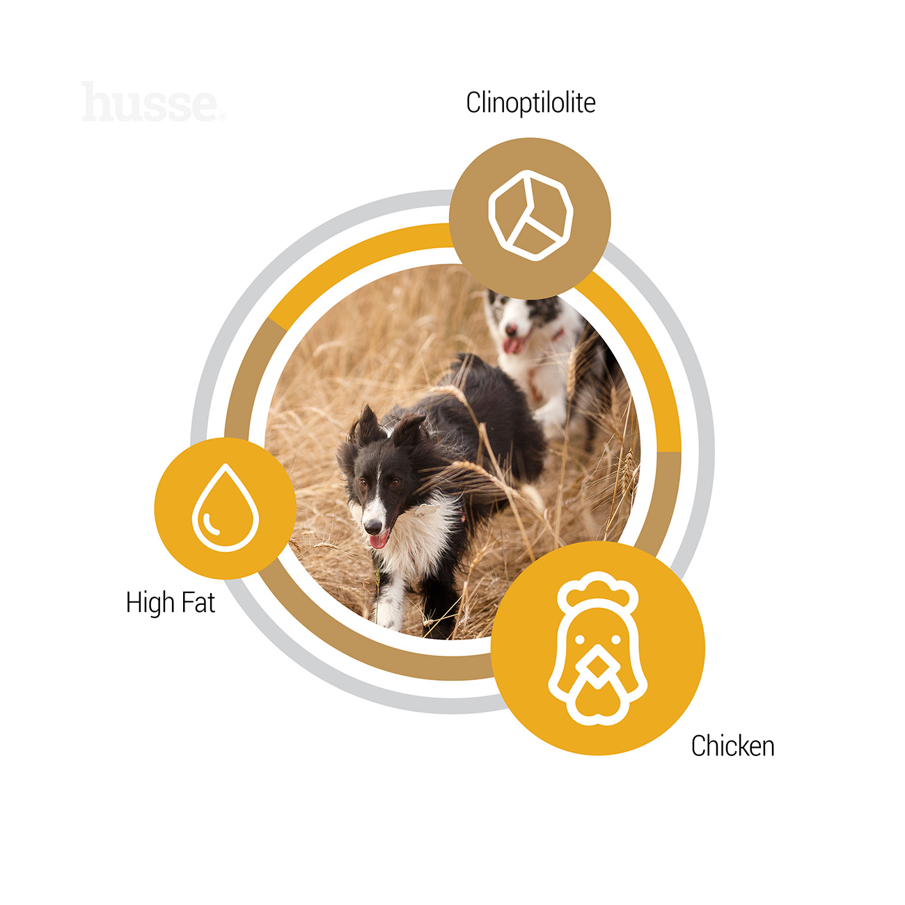 Vistas gaļa, kartupeļi, kaltēti zirņi, dzīvnieku tauki, linsēklas, dārzeņu šķiedras, raugs, hidrolizēts dzīvnieku gaļas proteīns, lašu eļļa, sāls, kaltēti olu dzeltenumi un baltumi, frukto-oligosaharīdi (0,3 %), lecitīns, jūras aļģes, samtenes.